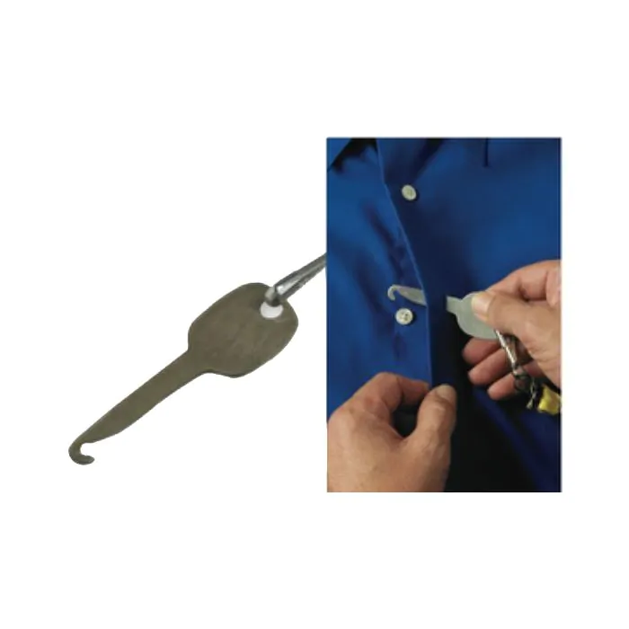 This tool easily inserts into button holes and quickly pulls buttons through for closure.