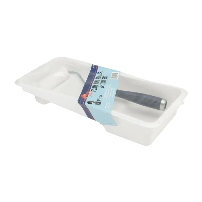Complete package contents include one foam roller, one roller handle, and one paint tray.